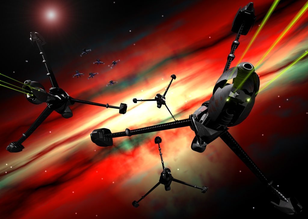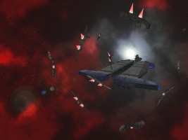 First Moves The Telians, Tortugans, Pelorans, and Bastet met each other over a hundred years ago in the Earth year 2307 AD. Knowing of the growing threat the Alkari projected from the north, Aneerin of the Confederation broke the normal Peloran rules and helped forge an alliance with each race. He was removed from his position in the White Council and as an admiral of the Gwynyth Fleet for that since Gwynyth Family wished to be allied with the Alkari, not the weaker aliens surrounding them. But in 2308 as the Earthers measure time, the aggressive Cronyl Family precipitated a nearly disastrous territorial dispute with the Alkari. The Alkari Empire, nearly the size of the entire Alliance and far more advanced in technology struck Cronyl hard. The Cronyl warriors had never even contemplated what deflector shields could do and were completely unprepared for them. That and the far better Alkari fighters made defeat for Cronyl in Soryn a forgone conclusion. The warriors there fought hard and slowed the Alkari long enough for them to get word back to Homeworld where a cry for help quickly went to their new allies. The allies that Gwynyth had not yet had time to tell where they could stick themselves. The Alkari followed up with a two pronged attack into the Vorclyne and Hollyn systems. The Cronyl defenses were strong, but the sheer overwhelming numbers and technology carried the day for the Alkari assaults. The Bastet were the first to respond to the Confederation's plea and sent several squadrons of fast destroyers to help. Only the stealth technology of the Confederation and the Bastet saved the battles in Hollyn and Vorclyn from being a complete defeat for them though. And only with the help of Duron and the Bastet were the Cronyl able to withdraw nearly half of their standing fleets in those two systems back to Homeworld. The Alkari then waited and prepared for a massive two pronged assault on the Homeworld of the Confederation. The Telians and Tortugans were slow to respond though, not trusting the Confederation because of Aneerin's removal. Gwynyth Family was quickly removed from its position as the Confederation's voice to the aliens and the Confederation Council began looking for Aneerin who had completely disappeared. They finally found him in the company of Crelyn the Grey, a three hundred year old Grey Master. The council told him that he was free to make alliances and pacts as he saw fit and Aneerin agreed to return. He quickly moved out to speak with the two reluctant allies and the Tortugans were instantly mollified by his return. They began marshalling for war. The Battle of Homeworld Two days later, the Alkari attacked Homeworld. It was a brutal battle, with massive numbers on the Alkari side forcing their way into the system on two fronts. On the first day, the Alkari assaulted the warp points and gained a beachhead into the system. The next day the Alkari continued to push in-system with innumerable skirmishes and tactics being employed. However, despite losing ground the joint fleets of the Families and the Bastet were holding their own and were beginning to stifle the Alkari attack. The Alkari admiral recognizing that the initiative could be lost and having just heard that the Bastet had attacked the system now known as Prilan on the other side of Alkari space brought in large numbers of reinforcements and planned an all out attack on Homeworld itself. The third day was the bloodiest of the battle, with a concentrated attack on the planet, and the Alkari hoped to once and for all defeat the Confederation. Below is shown a surviving image of Duron's First Battle Fleet and a force of Bastet destroyers moving to flank the Alkari formation. In the end, it was a Pyrrhic victory for the Alliance fleets. Losses were heavy on both sides but the Alliance still controlled the skies around the planet. The Alkari controlled much of the outer system still and would for a very long time with fighting in the system happening nearly 24 hours a day. The battle would go on for more almost a year as the Alkari continued to try to push the Confederation out of the system and even determined pushes by the Tortugan fleets were unable to defeat the invaders. The 'Homeworld Meat Grinder' was the nickname given to that long year of hell. The Alkari had expected an assault by the other Alliance members during this battle and planned accordingly. The first assault by the Bastet led by the Vir Soban and Durenam clans broke through into Prilan and used a prototype ship and weapon to destroy an Alkari base. The ship and her consorts then moved to the main planet in the system, fighting a running battle with the surviving Alkari forces all the way. The ship's first shot on the colony killed a hundred thousand Alkari civilians and their remaining forces attacked with a fury that Bastet could not handle. Putting aside all thoughts of survival, they simply destroyed everything they could. In the end a handful of escorts and a single fleet carrior survived the fight to defend the system. A week later, the Tenth Space Wing jumped into Eladral, found the Vir Soban and Silaven base that had supported the research and developement of the new ship, and burned it to the ground with nuclear fire. Dirty nuclear fire. The other Bastet clans responded and pushed the Tenth Space Wing out of Eladral. Not knowing what the two clans had done as everyone who knew anything other then the Alkari were dead, the Bastet never forgave the Alkari for cold-blooded attack and vowed to make them pay for destroying the power of two clans. But instead of pushing harder there on the fringes of their space and losing the Peloran Homeworld, the Bastet began moving ships and personal into Confederation space in support of the Battle of Homeworld while retaining a defensive posture in Eladral. Again Admiral Aneerin came through and convinced the Telians to honor the alliance despite their distrust of the odd politics in the Confederation. I