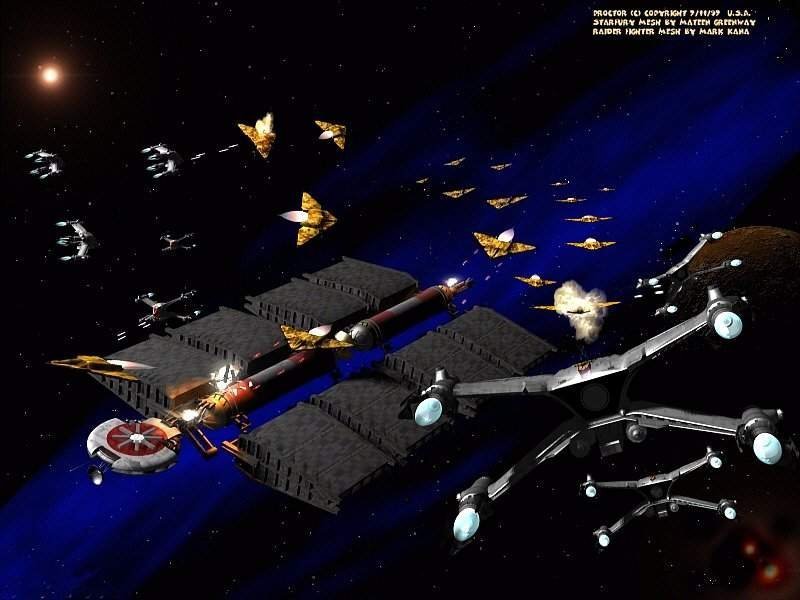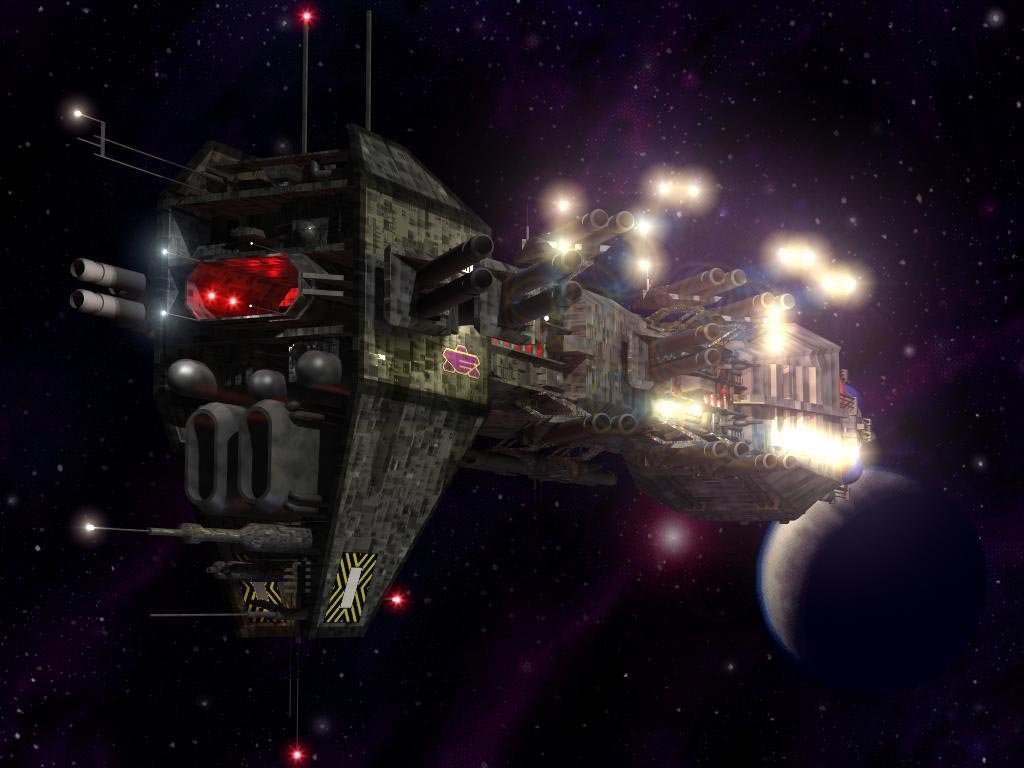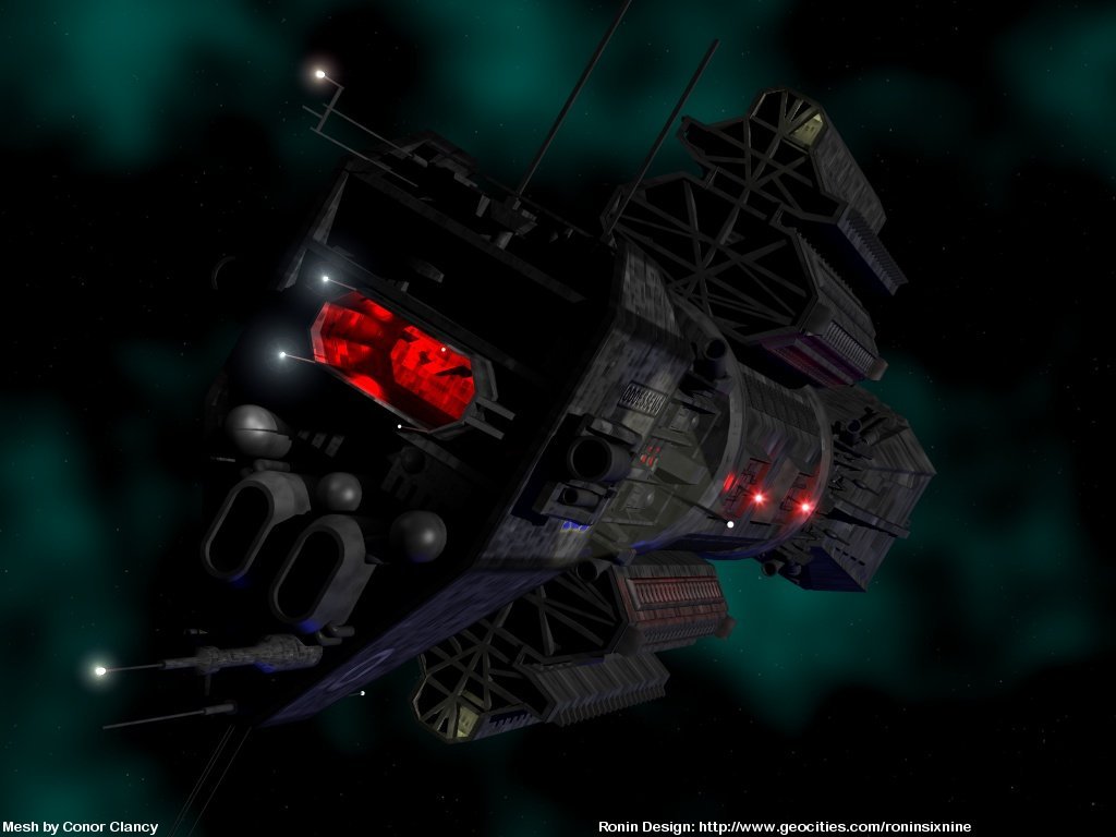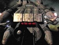 Mounting ten photon turrets in each arc like the comm ships, they also tend to avoid conflict when possible. Their main mission is to transport ground forces, cargo, and sometimes colonization teams in between planets. Above is a picture of a Duron standard transport and it's fighter escort under attack by raider squadrons sent from one of the Lesser Families. As you can see, the standard trial of possession has turned into a full-scale battle after the Lesser Family force fired on the transport in frustration.